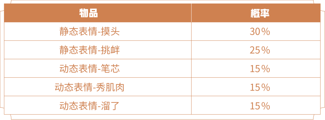 打开后可随机获得以下未拥有的表情之一,摸头、挑衅、笔芯(动态)、秀肌肉(动态)、溜了(动态)。
