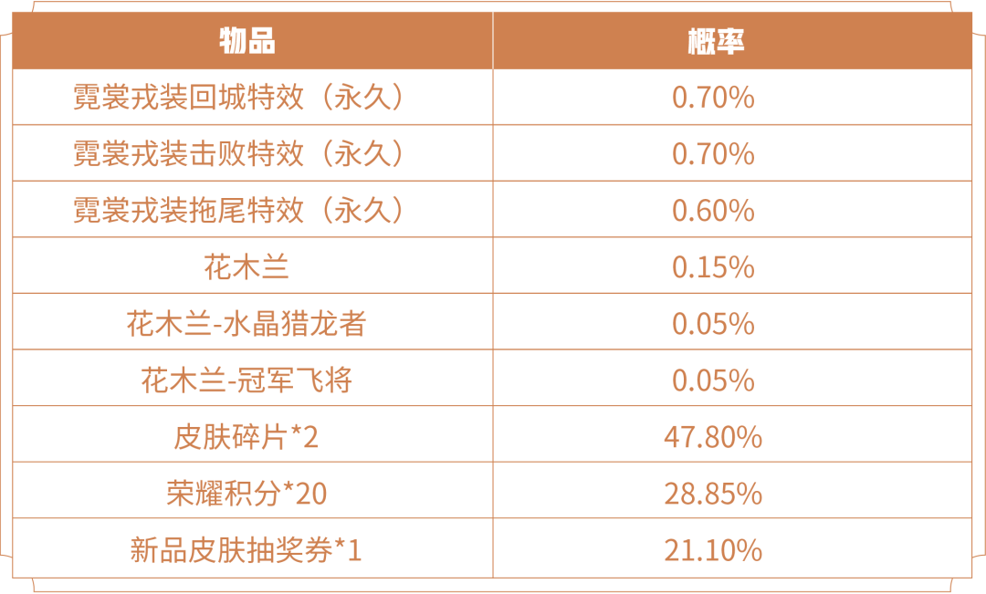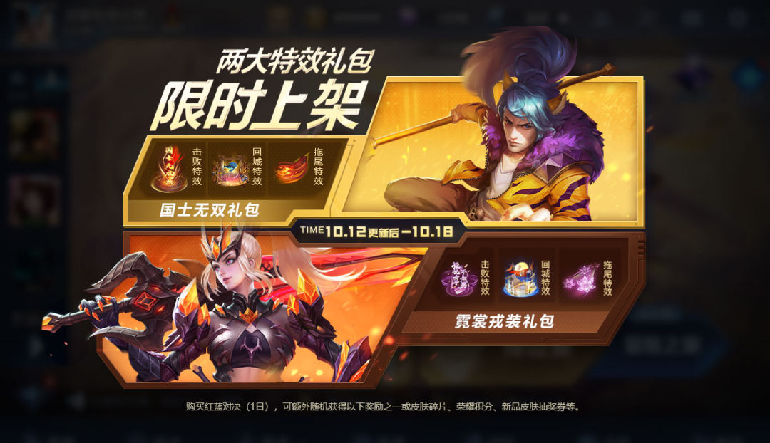 霓裳戎装礼包:购买红蓝对决(1日),可额外随机获得以下之一,花木兰专属击败特效、回城特效和拖尾特效-霓裳戎装(永久)、花木兰、花木兰-水晶猎龙者、花木兰-冠军飞将、荣耀积分*20、皮肤碎片*2、新品皮肤抽奖券*1