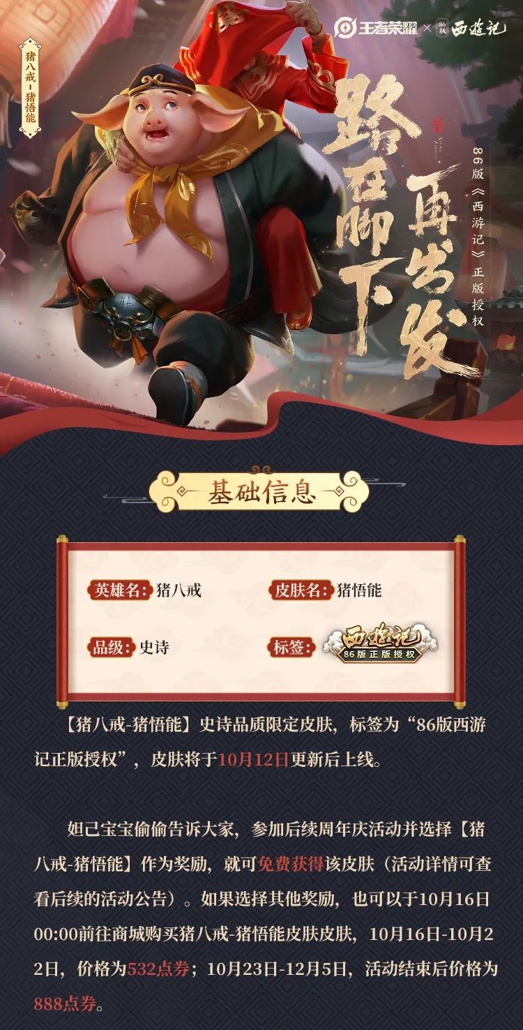 西游记系列限定皮肤猪八戒-猪悟能即将上线,活动期间拥有皮肤即可领取个性动作-背媳妇。