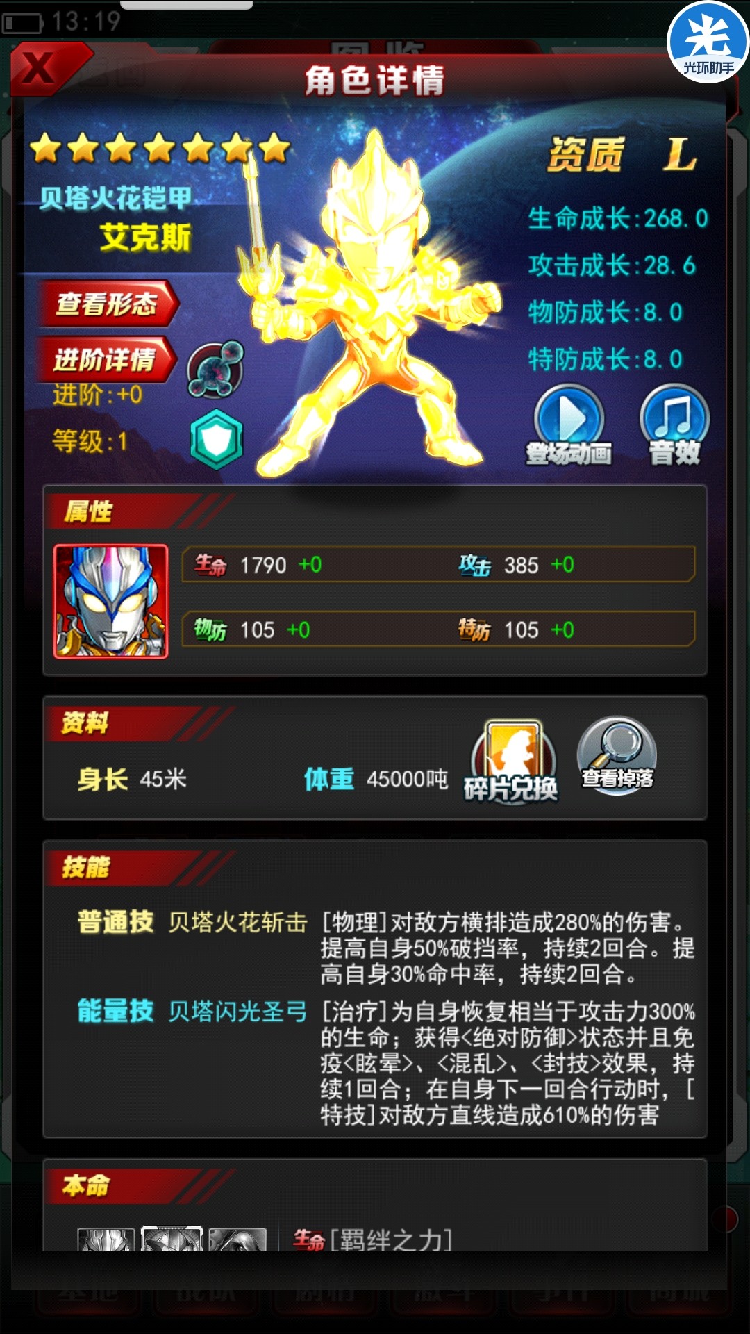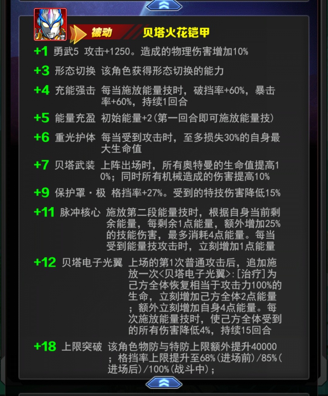 +4:每当释放能量技时指开大的第一阶段,加破挡和暴击各60%,对于这张破档,暴击需要很高的卡提升很大