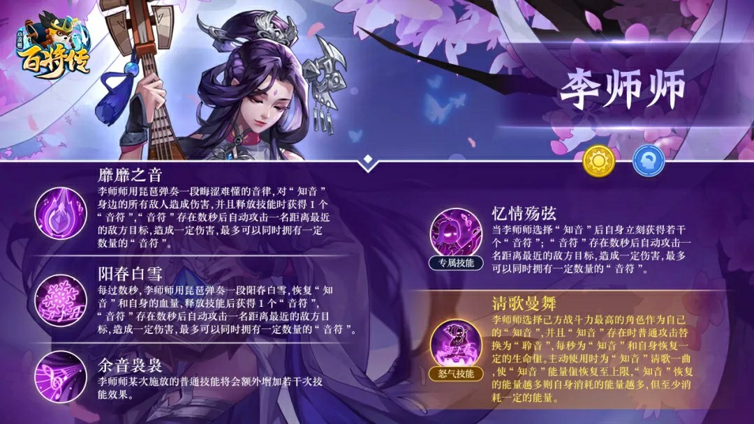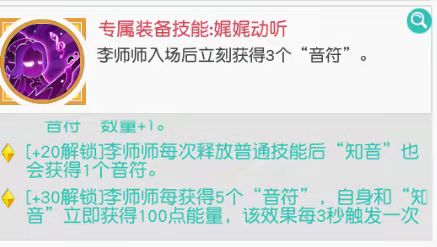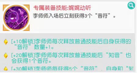 李师师拥有召唤音符的能力,可与己方战力最高的英雄成为“知音”,技能也是围绕知音和音符来施加效果的,技能一:可对知音身边所有敌人造成伤害,是一个小范围伤害技能,并且召唤一个音符,音符可在数秒后自动攻击最近敌方的目标。技能二:恢复知音和自身血量,并且召唤一个音符,效果与技能一一致,技能三:在释放普通技能时有几率获得若干次技能效果,这个随机性比较大,预估随着等级提升,几率会比较趋于稳定,怒气技能:知音的普攻每秒可为知音和李师师恢复一定生命值,主动使用时会为知音恢复能量至上限,知音恢复能量越多则李师师自身消耗能连也越多(预估随着等级提升,李师师消耗自身能量会变少)