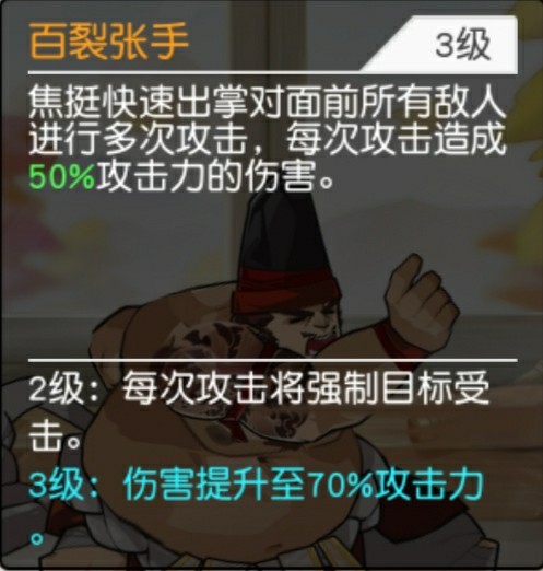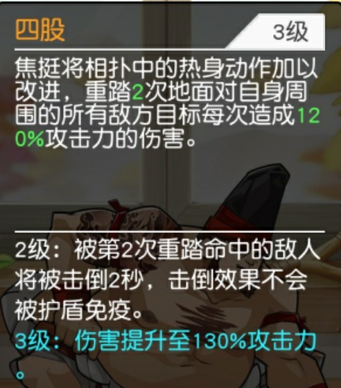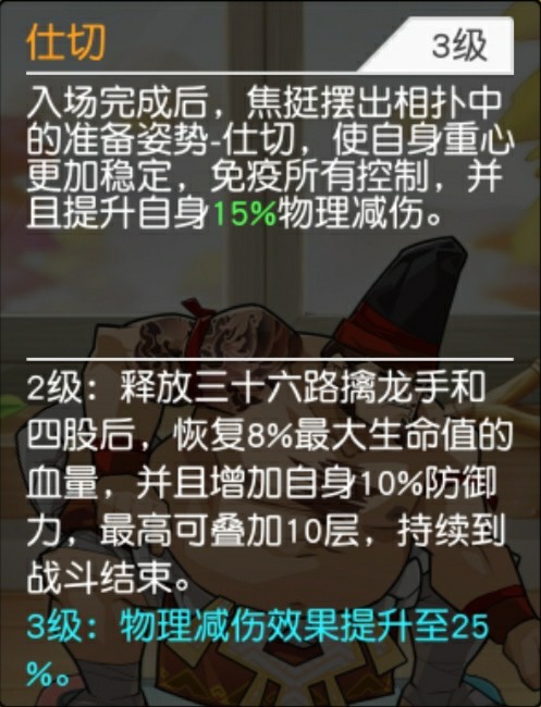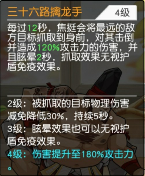 解析:三十六路擒拿手是少林的招式,小擒拿手是武当的,策划竟然给了相扑呢?好怪!这是焦挺的一个强力控制技能,可以抓取最远程的敌人到身前,造成伤害后并击倒且眩晕2秒,无视敌人护盾免疫效果,随着技能提升,伤害也提升同时被抓取的敌人物理伤害减免降低30%,持续5秒,且眩晕也可以无视护盾免疫效果,再控制的角度看,是一个非常优秀的数一数二的技能,能拉近配合我方近战优先击杀敌方远程英雄,但是,注意但是这个技能并不是开场立即施放的,需要6秒后才能施放然后需要1秒抓取到身边,7秒完成整个过程,和李应有些类似,之后每过12秒才能释放一次,所以这个技能不能算是最上乘的,但是效果确实很棒很实用的。