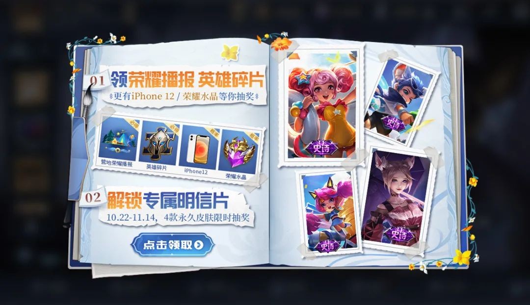 活动期间,在活动页面领取每日任务,或在王者营地特定场景触发行为,可以获取解锁明信片的专属道具,解锁明信片获得阶段奖励,全部解锁获得王者营地专属荣耀播报。